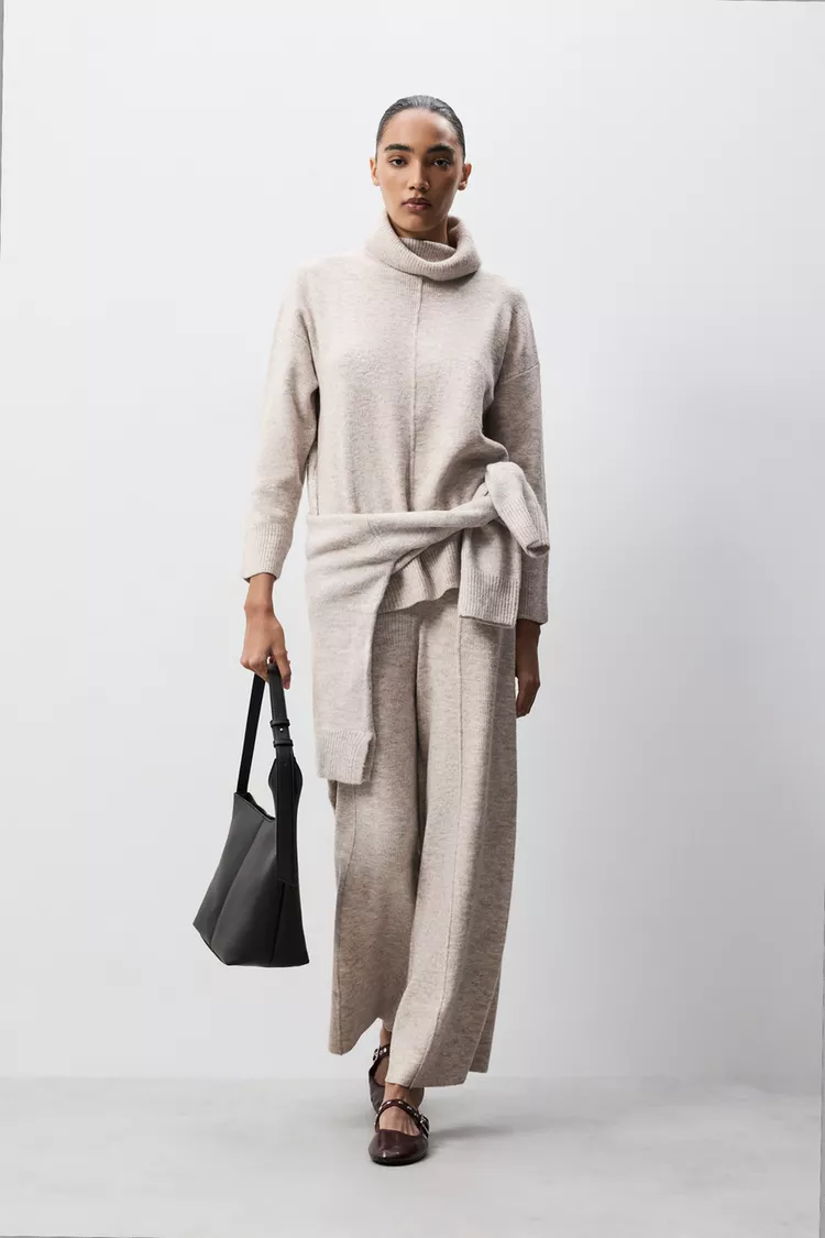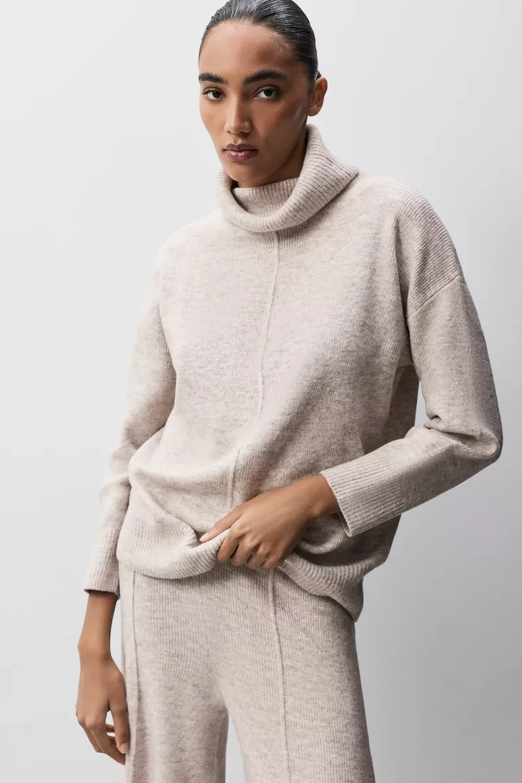 Long sleeve roll neck sweater. Features a vertical rib detail on the front. It has a loose fit and is made of knitted fabric.